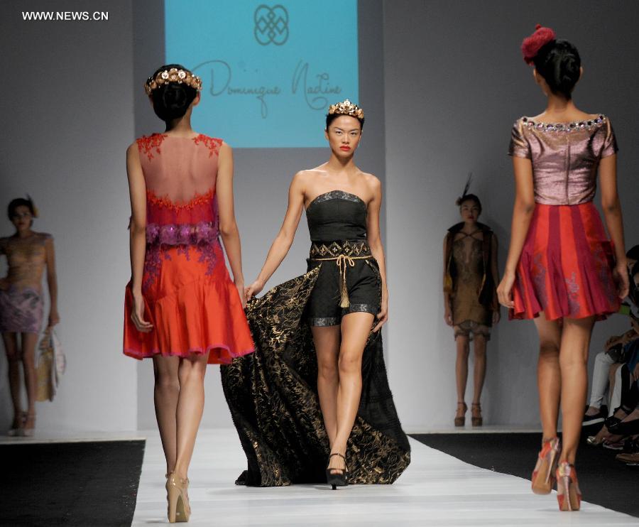 Models present creations by Indonesian designer Dominique Nadine during the Jakarta Fashion Week 2015 in Jakarta, Indonesia, Nov. 5, 2014. (Xinhua/Agung Kuncahya B.)
