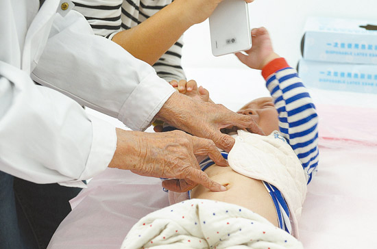 Zhang does abdominal examination for a child. (China Youth Daily)