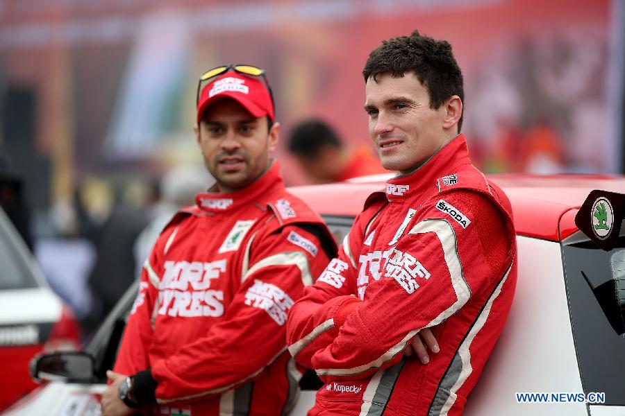 Jan Kopecky (R) of Team MRF reacts at the opening ceremony of the 2014 Asia-Pacific Rally Championship held in Longyou, east China's Zhejiang province, on Nov. 7, 2014. (Xinhua/Li Ming)