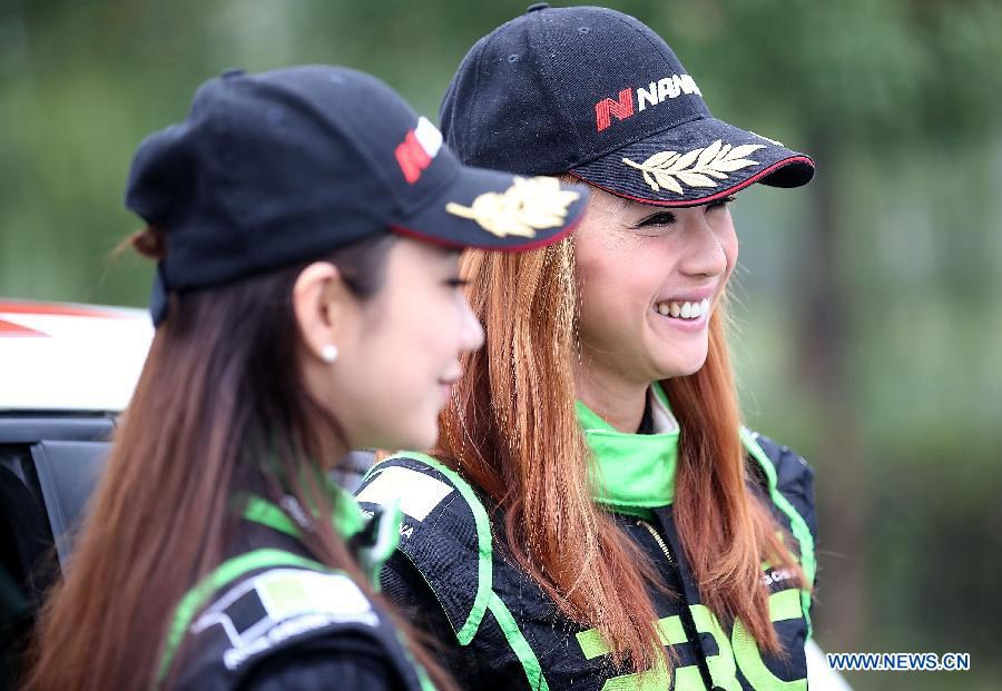 Shen Huilan(R)/Chen Yiwen of team MIT motorsport react at the opening ceremony of the 2014 Asia-Pacific Rally Championship held in Longyou, east China's Zhejiang province, on Nov. 7, 2014. (Xinhua/Li Ming)