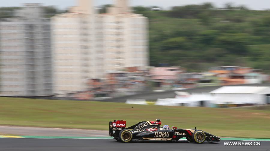 Lotus driver Romain Grosjean drives during the qualifying session of 2014 Formula One Brazilian Grand Prix at the Interlagos circuit in Sao Paulo, Brazil, Nov. 8, 2014. Grosjean ranked the fifteenth with 1 minute 12.037 seconds. (Xinhua/Xu Zijian)
