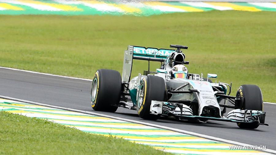 Mercedes driver Lewis Hamilton drives during the qualifying session of 2014 Formula One Brazilian Grand Prix at the Interlagos circuit in Sao Paulo, Brazil, Nov. 8, 2014. Hamilton ranked the second with 1 minute 10.056 seconds. (Xinhua/Xu Zijian)