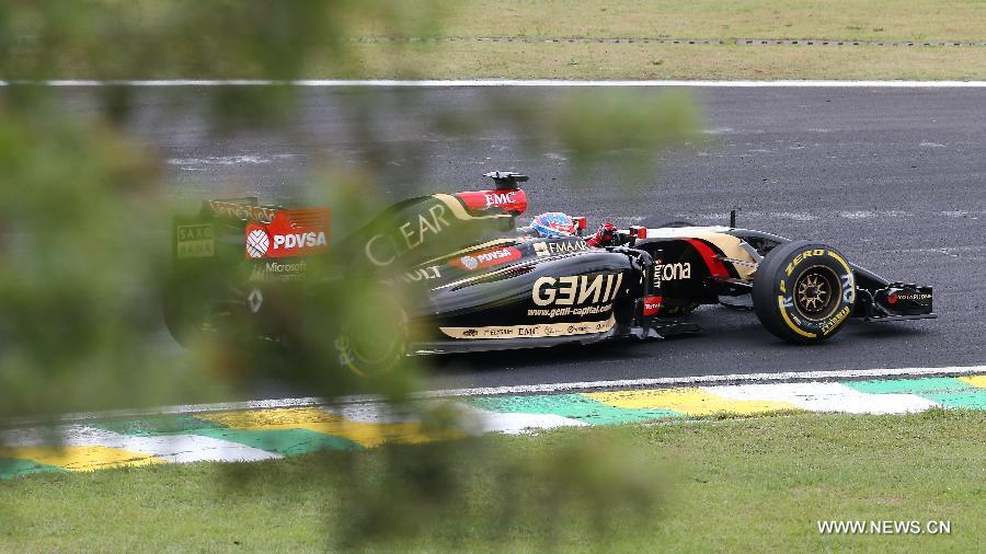 Lotus driver Romain Grosjean drives during the qualifying session of 2014 Formula One Brazilian Grand Prix at the Interlagos circuit in Sao Paulo, Brazil, Nov. 8, 2014. Grosjean ranked the fifteenth with 1 minute 12.037 seconds. (Xinhua/Xu Zijian)