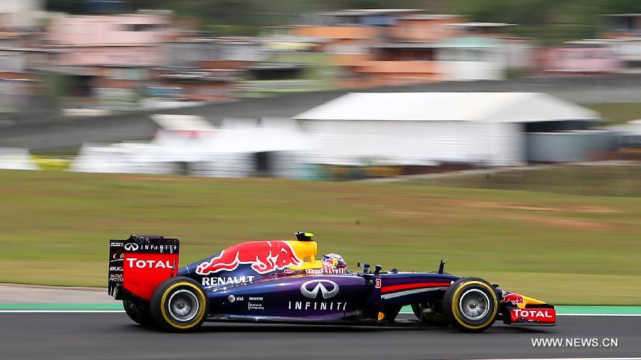 Red Bull Racing Daniel Ricciardo drives during the qualifying session of 2014 Formula One Brazilian Grand Prix at the Interlagos circuit in Sao Paulo, Brazil, Nov. 8, 2014. Ricciardo ranked the ninth with 1 minute 11.075 seconds. (Xinhua/Xu Zijian)