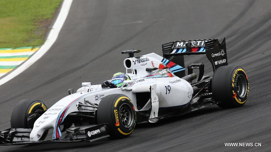 Williams driver Felipe Massa drives during the qualifying session of 2014 Formula One Brazilian Grand Prix at the Interlagos circuit in Sao Paulo, Brazil, Nov. 8, 2014. Massa ranked the third with 1 minute 10.247 seconds. (Xinhua/Xu Zijian)