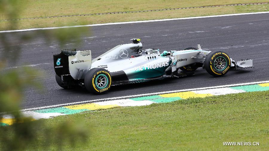 Mercedes driver Nico Rosberg drives during the qualifying session of 2014 Formula One Brazilian Grand Prix at the Interlagos circuit in Sao Paulo, Brazil, Nov. 8, 2014. Rosberg ranked the first with 1 minute 10.023 seconds. (Xinhua/Xu Zijian)