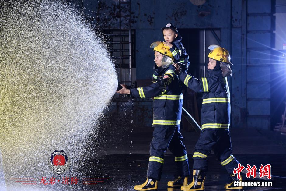 This group of photos is a birthday gift from the firefighters of Longyan Fire Department to Zhuang Yuming, who is a little fan of firefighters. In order to help Zhuang realize his dream, the firefighters decided to give him this special birthday present by making him mini firefighter uniform, and arranging a photo shoot with them in the fire department.