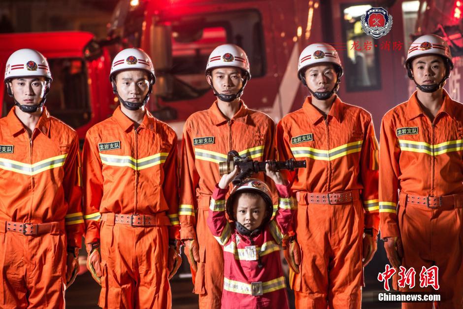 This group of photos is a birthday gift from the firefighters of Longyan Fire Department to Zhuang Yuming, who is a little fan of firefighters. In order to help Zhuang realize his dream, the firefighters decided to give him this special birthday present by making him mini firefighter uniform, and arranging a photo shoot with them in the fire department.