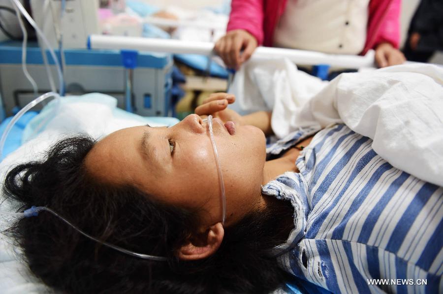 An injured woman receives treatment at the Renmin Hospital in Du'an Yao Autonomous County, south China's Guangxi Zhuang Autonomous Region, Nov. 10, 2014. Nine people were killed and five others injured when the overloaded vehicle drove off a cliff here on Nov. 9. (Xinhua/Zhang Ailin)