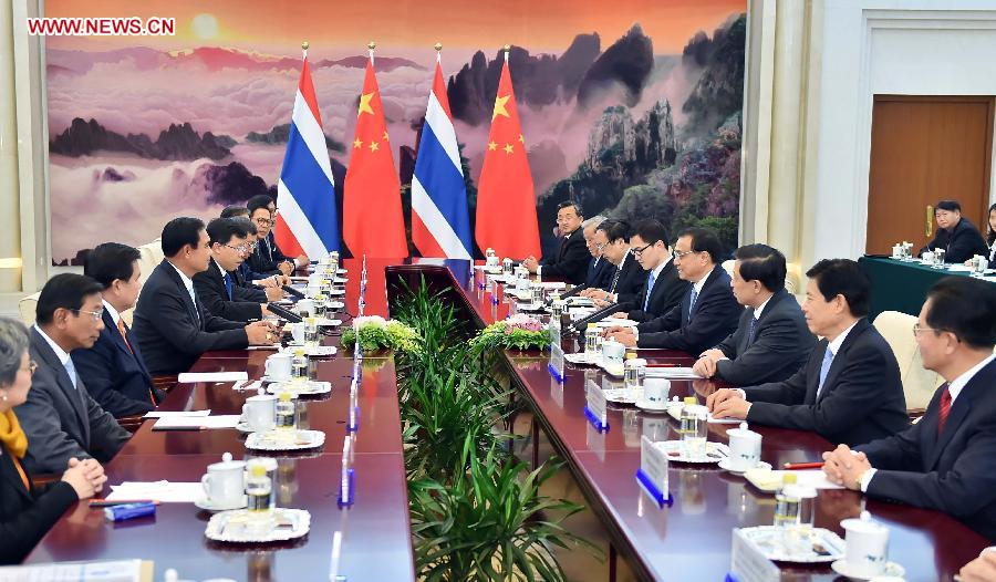 Chinese Premier Li Keqiang meets with Thai Prime Minister Prayuth Chan-ocha at the Great Hall of the People in Beijing, capital of China, Nov. 9, 2014. (Xinhua/Li Tao)