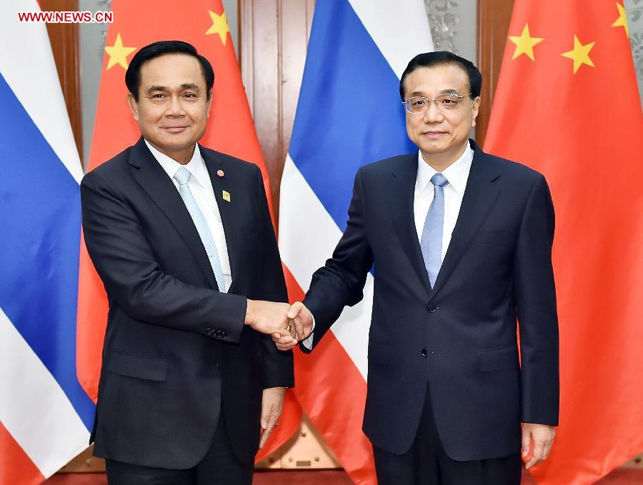 BEIJING, Nov. 9 -- Chinese Premier Li Keqiang and his Thai counterpart Prayut Chan-o-cha met here Sunday and agreed to strengthen bilateral cooperation in railway, agriculture and trade.