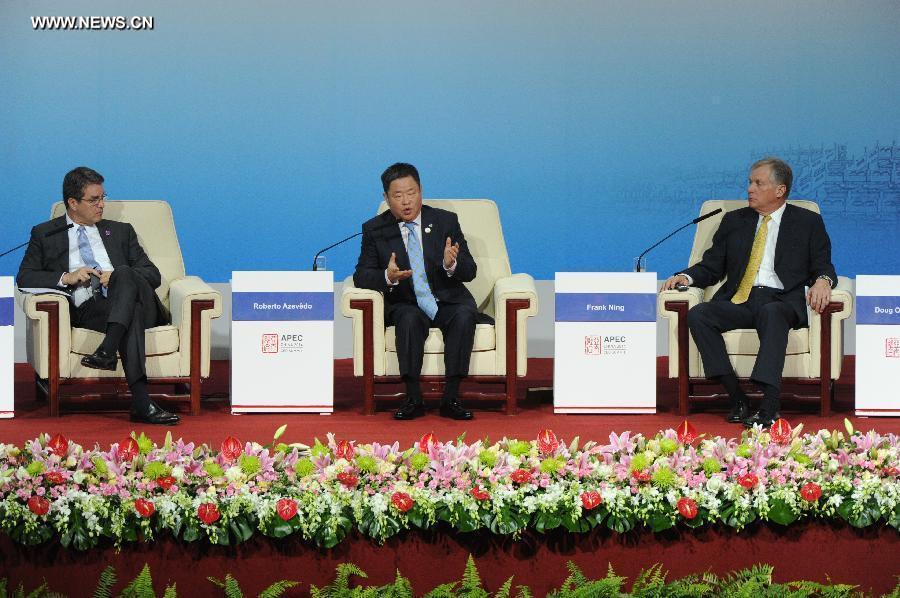Chairman of COFCO Corporation Frank Ning (C) speaks in a summit dialogue on Asia-Pacific economic integration and global multilateral trade system during the 2014 Asia-Pacific Economic Cooperation (APEC) CEO Summit in Beijing, capital of China, Nov. 9, 2014. The 2014 APEC CEO Summit opened in Beijing on Sunday. (Xinhua/Luo Xiaoguang)