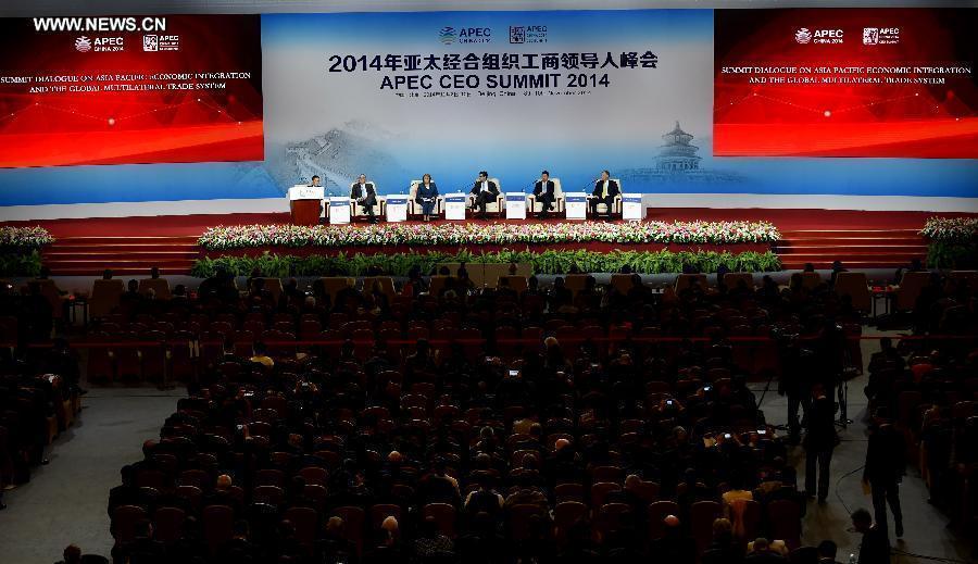 A summit dialogue on Asia-Pacific economic integration and global multilateral trade system is held during the 2014 Asia-Pacific Economic Cooperation (APEC) CEO Summit in Beijing, capital of China, Nov. 9, 2014. The 2014 APEC CEO Summit opened in Beijing on Sunday. (Xinhua/Wang Jianhua)