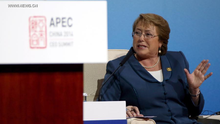 Chilean President Michelle Bachelet speaks in a summit dialogue on Asia-Pacific economic integration and global multilateral trade system during the 2014 Asia-Pacific Economic Cooperation (APEC) CEO Summit in Beijing, capital of China, Nov. 9, 2014. The 2014 APEC CEO Summit opened in Beijing on Sunday. (Xinhua/Yin Gang)