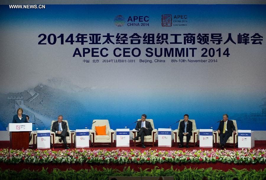 (L-R) Chilean President Michelle Bachelet, Global Chairman of PricewaterhouseCoopers International Ltd. Dennis Nally, Director-General of World Trade Organization (WTO) Roberto Azevedo, Chairman of COFCO Corporation Frank Ning, and Chairman and CEO of Caterpillar Inc. Douglas Oberhelman attend a summit dialogue on Asia-Pacific economic integration and global multilateral trade system during the 2014 Asia-Pacific Economic Cooperation (APEC) CEO Summit in Beijing, capital of China, Nov. 9, 2014. (Xinhua/Luo Xiaoguang)