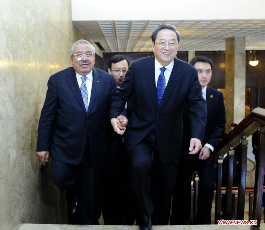 Yu Zhengsheng (R, front), chairman of the National Committee of Chinese People's Political Consultative Conference (CPPCC), walks into the venue hand in hand with the President of the Jordanian Senate Abdul Raouf Rawabdeh (L, front) before their talks in Amman, Jordan, Nov. 9, 2014. Yu Zhengsheng held talks with Abdul Raouf Rawabdeh here on Sunday. (Xinhua/Zhang Duo)