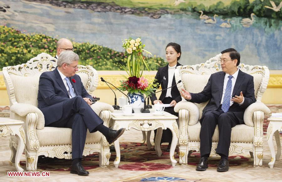 Zhang Dejiang (R), chairman of the Standing Committee of the National People's Congress of China, meets with Canadian Prime Minister Stephen Harper at the Great Hall of the People in Beijing, capital of China, Nov. 9, 2014. (Xinhua/Xie Huanchi)