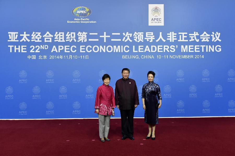 Chinese President Xi Jinping (C), his wife Peng Liyuan (R) and South Korean President Park Geun-hye pose for photo before a welcome banquet for the 22nd Asia-Pacific Economic Cooperation (APEC) Economic Leaders' Meeting in B?eijing, capital of China, Nov. 10, 2014. (Xinhua/Xie Huanchi)