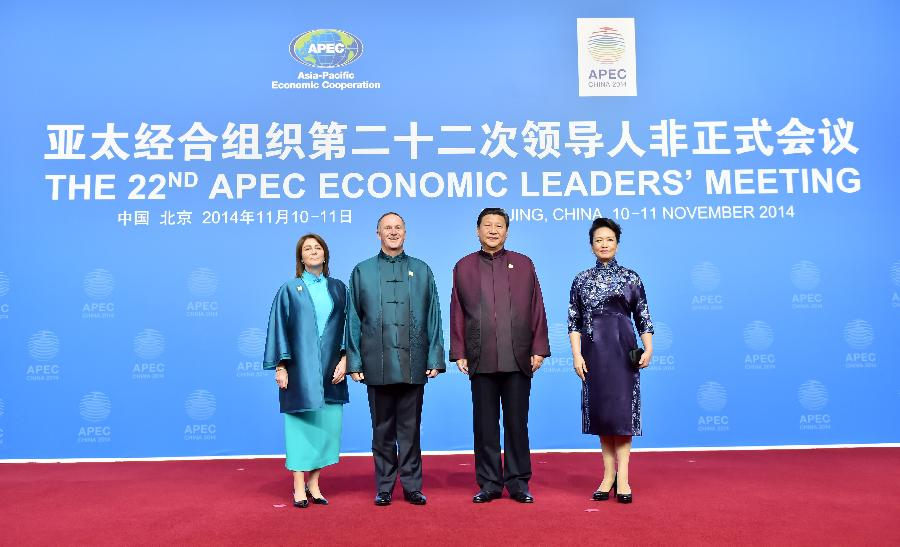 Chinese President Xi Jinping (2nd R), his wife Peng Liyuan (R), New Zealand's Prime Minister John Key (2nd L) and his wife Bronagh Key pose for photo before a welcome banquet for the 22nd Asia-Pacific Economic Cooperation (APEC) Economic Leaders' Meeting in B?eijing, capital of China, Nov. 10, 2014. (Xinhua/Li Tao)