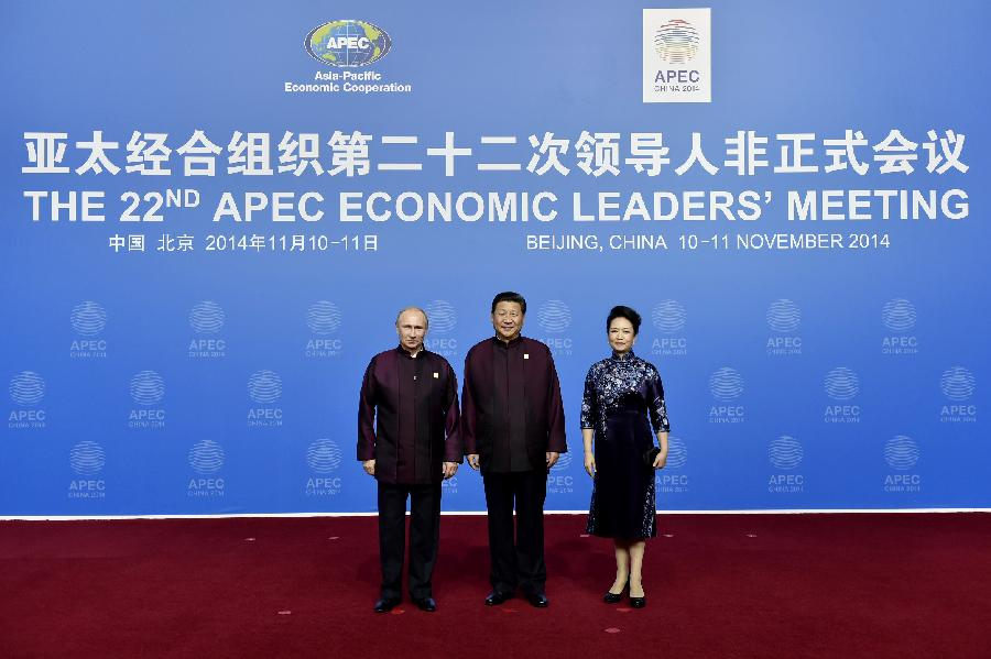 Chinese President Xi Jinping (C) and his wife Peng Liyuan (R) pose for photo with Russian President Vladimir Putin before a welcome banquet for the 22nd Asia-Pacific Economic Cooperation (APEC) Economic Leaders' Meeting in Beijing, China, Nov. 10, 2014. (Xinhua/Xie Huanchi)