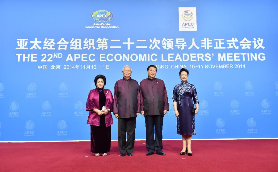 Chinese President Xi Jinping (2nd R), his wife Peng Liyuan (R), Malaysian President Najib Razak (2nd L) and his wife Rosmah Mansor pose for photo before a welcome banquet for the 22nd Asia-Pacific Economic Cooperation (APEC) Economic Leaders' Meeting in B?eijing, capital of China, Nov. 10, 2014. (Xinhua/Li Tao)