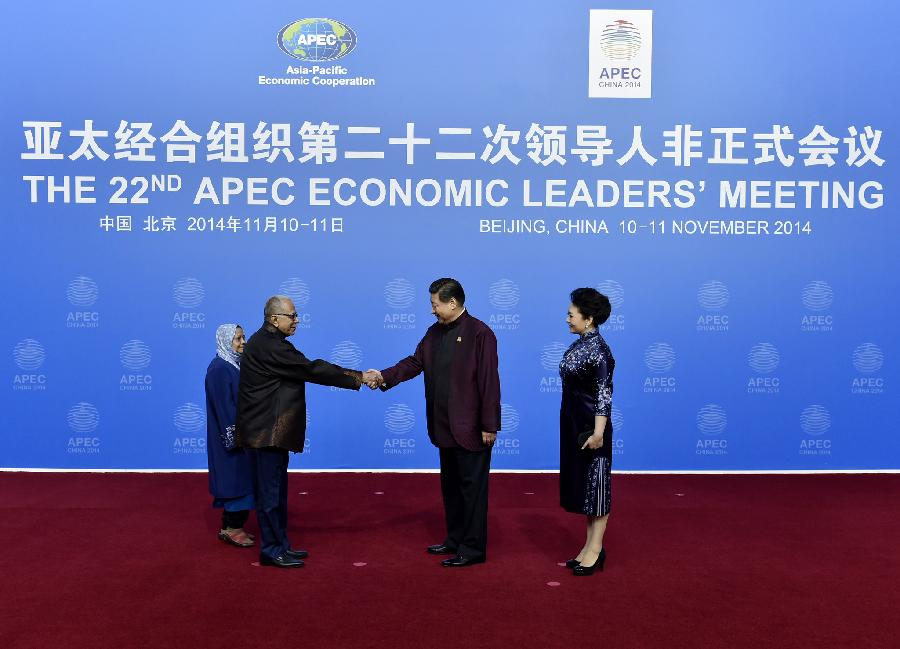 Chinese President Xi Jinping (2nd R), his wife Peng Liyuan (R), Bangladeshi President Abdul Hamid (2nd L) and his wife Rashida prepare to pose for photo before a welcome banquet for the 22nd Asia-Pacific Economic Cooperation (APEC) Economic Leaders' Meeting in B?eijing, capital of China, Nov. 10, 2014. (Xinhua/Xie Huanchi)