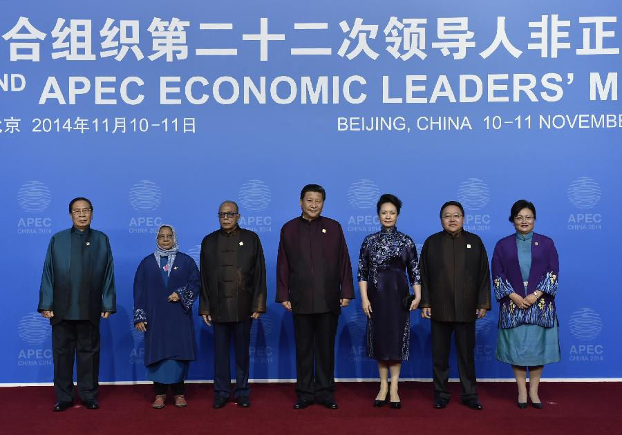 Chinese President Xi Jinping (C) and his wife Peng Liyuan (3rd R) pose for photos with Lao President Choummaly Sayasone (1st L), Bangladeshi President Abdul Hamid (3rd L), his wife Rashida (2nd L), Mongolian President Tsakhiagiin Elbegdorj (2nd R) and his wife Khajidsuren Bolormaa, who have been in China for a dialogue meeting on strengthening connectivity and improving cooperation, before a welcome banquet for the 22nd APEC Economic Leaders' Meeting in Beijing, capital of China, Nov. 10, 2014. (Xinhua/Xie Huanchi)