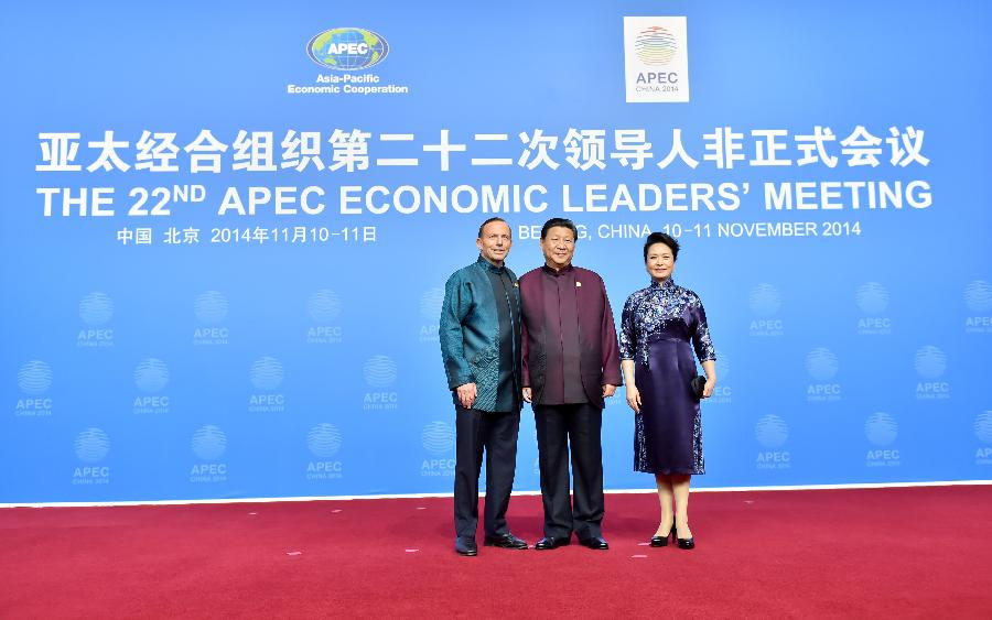 Chinese President Xi Jinping (C) and his wife Peng Liyuan (R) pose for photo with Australian Prime Minister Tony Abbott before a welcome banquet for the 22nd Asia-Pacific Economic Cooperation (APEC) Economic Leaders' Meeting in Beijing, China, Nov. 10, 2014. (Xinhua/Li Tao)