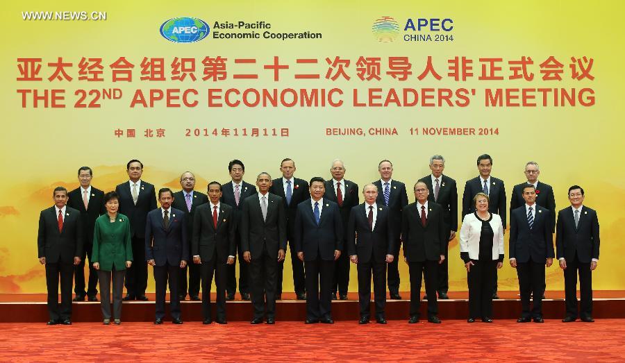 | Chinese President Xi Jinping poses for a group photo with participants of the 22nd APEC Economic Leaders' Meeting in Beijing, capital of China, Nov. 11, 2014. (Xinhua/Yao Dawei) |