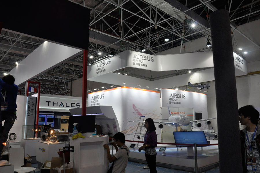 Photo taken on Nov. 10, 2014 shows exhibitors getting ready for the 10th China International Aviation & Aerospace Exhibition (Airshow China 2014) scheduled from Nov. 11 to 16 in Zhuhai, south China’s Guangdong province. (People’s Daily Online/ Sun Zhao)