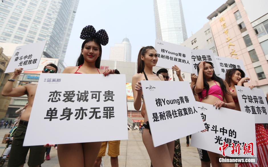 Placards reading "Although relationships are good, no one has the right to blame on singles", "Only you can decide your life" and "Pay tribute to singles" held by young people wearing summer clothes attract enormous attention in Nanjing, east China's Jiangsu province on Nov. 11, 2014. (CNS/Yang Bo)