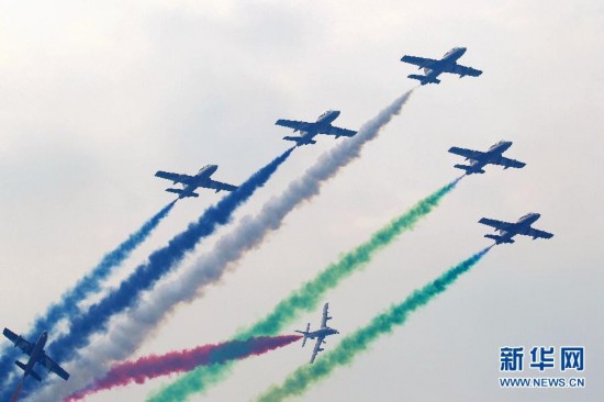 Photo taken on Nov. 11, 2014 shows the UAE’s National Aerobatic Team performing aerobatics at Airshow China. (Xinhua)