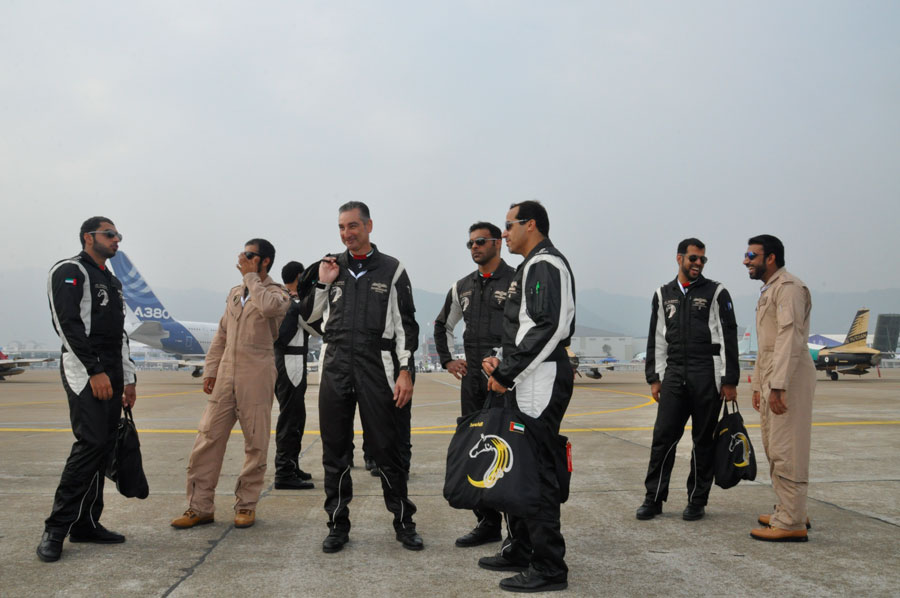 Photo taken on Nov. 11, 2014 shows pilots and mechanics of the United Arab Emirates’ National Aerobatic Team at the 10th China International Aviation & Aerospace Exhibition (Airshow China 2014) held from Nov. 11 to 16 in Zhuhai, south China’s Guangdong province. (People’s Daily Online/ Sun Zhao)