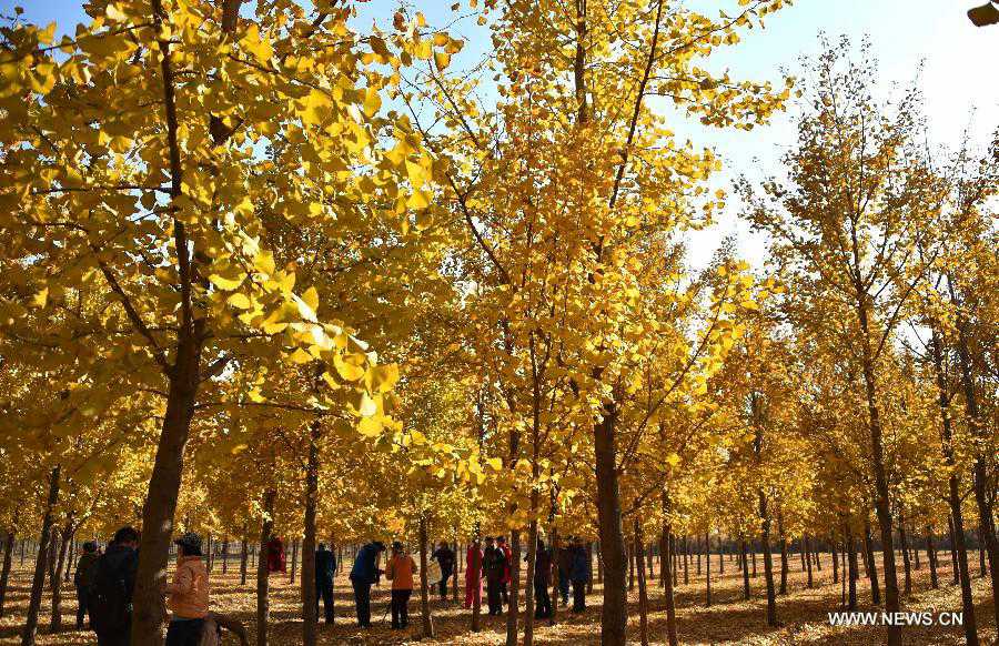 Citizens go sightseeing at a ginkgo forest in Ji'nan, capital of east China's Shandong Province, Nov. 13, 2014. (Xinhua/Xu Suhui)
