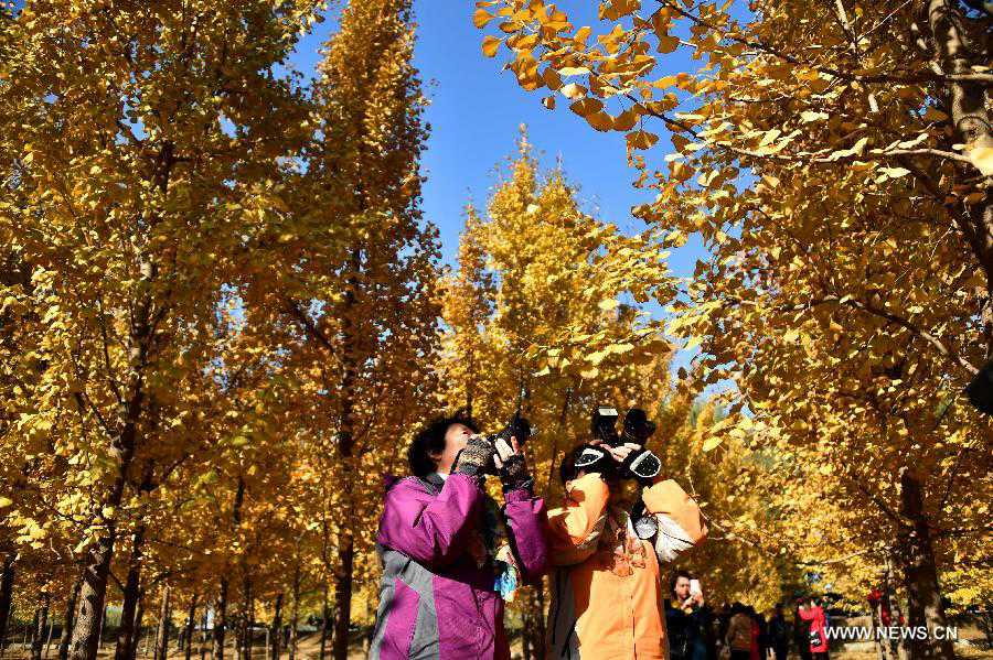 Visitors take photos at a ginkgo forest in Ji'nan, capital of east China's Shandong Province, Nov. 13, 2014. (Xinhua/Xu Suhui)