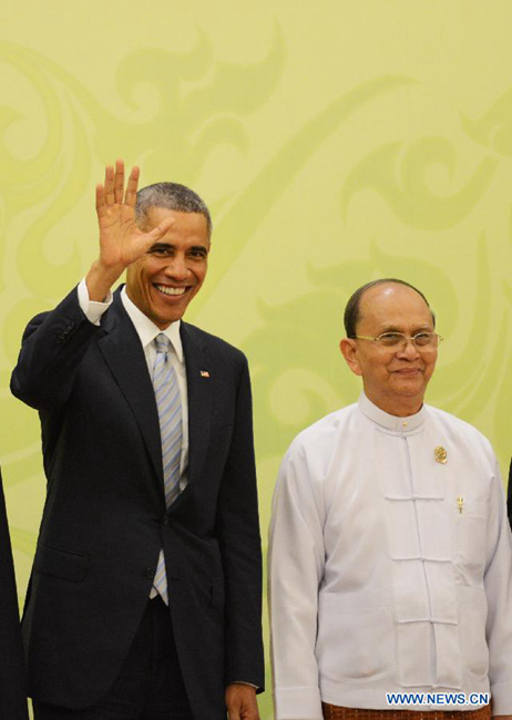 U.S. President Barack Obama (L) and Myanmar President U Thein Sein greet reporters during a photo session ahead of the 2nd ASEAN-U.S. Summit in Nay Pyi Taw, Myanmar, on Nov. 13, 2014. The 2nd ASEAN-U.S. Summit was held here on Thursday. (Xinhua/Liu Yun)