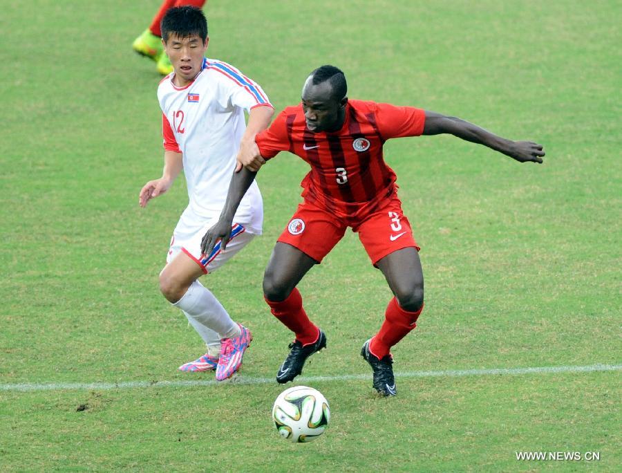 Om Chol Song (L) of the Democratic People's Republic of Korea (DPRK) vies with Agbo Fofo Wisdom of China's Hong Kong during their semifinals round match at the 2015 EAFF East Asian Cup in Taipei, southeast China's Taiwan, on Nov. 13, 2014. DPRK won 2-1. (Xinhua/Lo Ping Fai)
