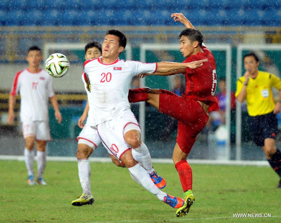 | Choe Won (L) of the Democratic People's Republic of Korea (DPRK) vies with Huang Yang of China's Hong Kong during their semifinals round match at the 2015 EAFF East Asian Cup in Taipei, southeast China's Taiwan, on Nov. 13, 2014. DPRK won 2-1. (Xinhua/Lo Ping Fai) |