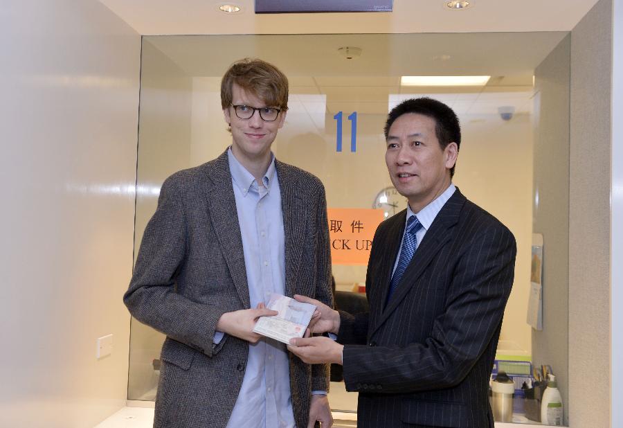 Edmund Thomas Downie (L) receives his long-term visa from Ruan Ping, Consul General at the Chinese Embassy in the U.S., at the Visa Department of the Chinese Embassy to the United States in Washington D.C., Nov. 12, 2014. China issued the first-ever group of visas with ten-year validity to U.S. citizens here on Wednesday, implementing a new agreement that is expected to boost exchange between the two countries. (Xinhua/Yin Bogu)