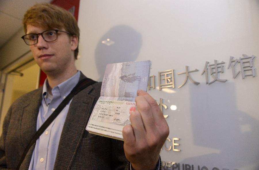 Edmund Thomas Downie shows his visa to the press after becoming the first American citizen to be issued a ten-year visa at the Visa Department of the Chinese Embassy to the United States in Washington D.C., Nov. 12, 2014. China issued the first-ever group of visas with ten-year validity to U.S. citizens here on Wednesday, implementing a new agreement that is expected to boost exchange between the two countries. (Xinhua/Yin Bogu)