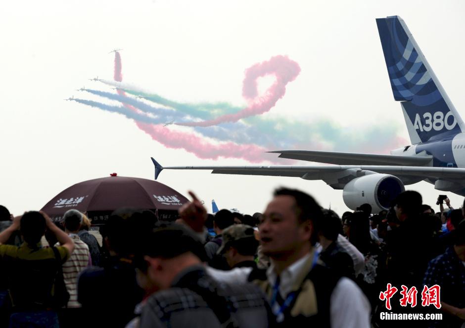 On Nov. 12, 2014, the Bayi Aerobatics Team of the Chinese Air Force, the Russian Knights Aerobatics Team and the United Arab Emirates’ National Aerobatic Team give splendid performances for guests from both home and abroad at the Airshow China 2014 in Zhuhai. (Chinanews/Chen Wen)