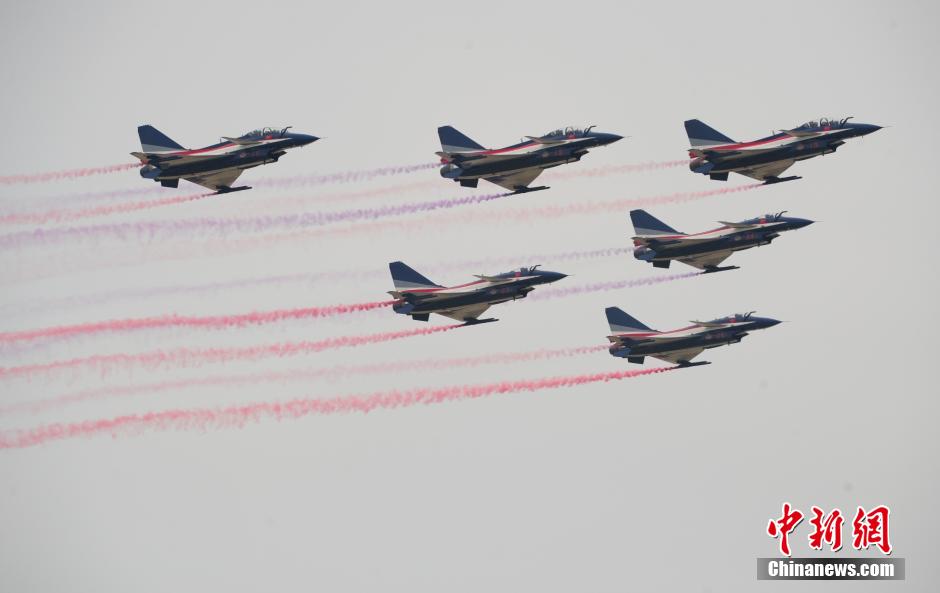On Nov. 12, 2014, the Bayi Aerobatics Team of the Chinese Air Force, the Russian Knights Aerobatics Team and the United Arab Emirates’ National Aerobatic Team give splendid performances for guests from both home and abroad at the Airshow China 2014 in Zhuhai. (Chinanews/Chen Wen)