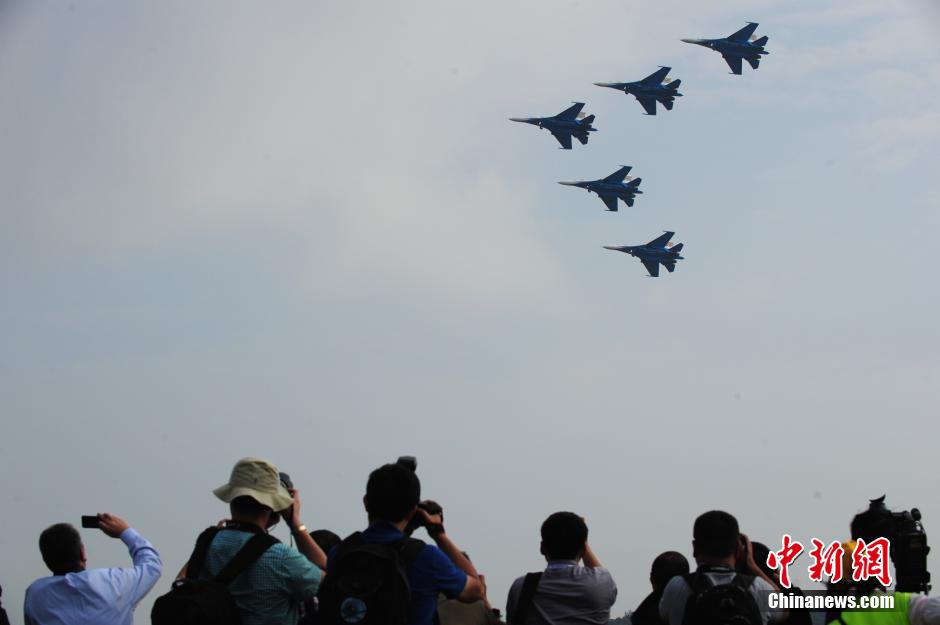 On Nov. 12, 2014, the Bayi Aerobatics Team of the Chinese Air Force, the Russian Knights Aerobatics Team and the United Arab Emirates’ National Aerobatic Team give splendid performances for guests from both home and abroad at the Airshow China 2014 in Zhuhai. (Chinanews/Chen Wen)