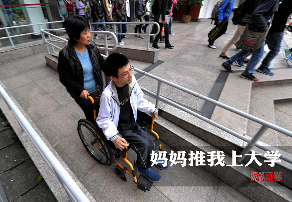 Lai Zhiqiang, a student in Fujian University of Traditional Chinese Medicine, suffers from post-polio syndrome. His left hand is paralyzed and his right hand trembles. He cannot walk normally. Lai's mother has started to accompany him to class since he was in middle school.