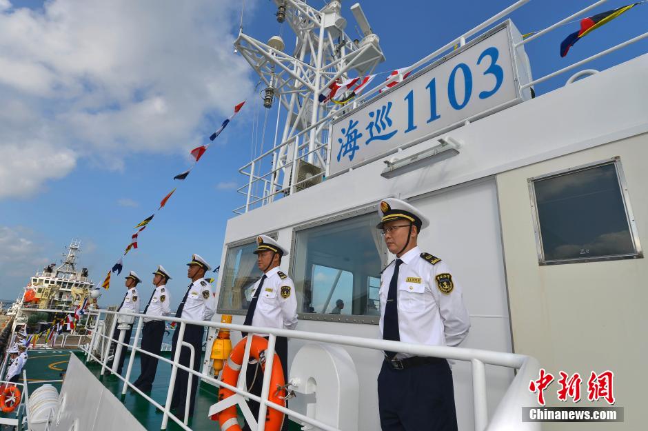 On Nov. 6, 2014, Haixun 1103, the first large patrol ship of the Sanya Maritime Safety Administration, was officially commissioned. The ship is 64 meters long, 10 meters wide, with 830 tons of displacement and 1,800 sea miles of cruising ability. The well-equipped ship is capable of conducting air and sea cruise under various weather conditions. (Chinanews/Luo Yunfei)