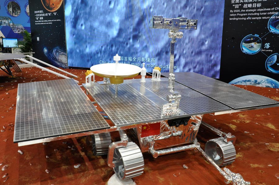 | A model of China’s homegrown lunar rover is seen at the 10th China International Aviation & Aerospace Exhibition (Airshow China 2014) held from Nov. 11 to 16 in Zhuhai, south China’s Guangdong province. (People’s Daily Online/ Sun Zhao) |