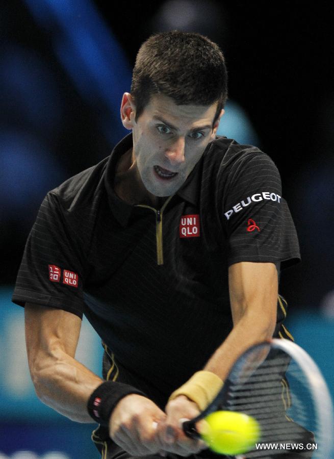 Novak Djokovic of Serbia returns the ball during the ATP World Tour Finals Group match against Tomas Berdych of the Czech Republic in London, Britain, on Nov. 14, 2014. Djokovic won 2-0. (Xinhua/Han Yan)