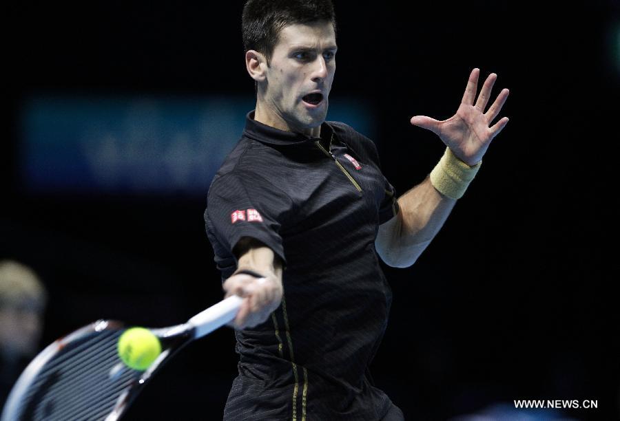 Novak Djokovic of Serbia returns the ball during the ATP World Tour Finals Group match against Tomas Berdych of the Czech Republic in London, Britain, on Nov. 14, 2014. Djokovic won 2-0. (Xinhua/Han Yan)