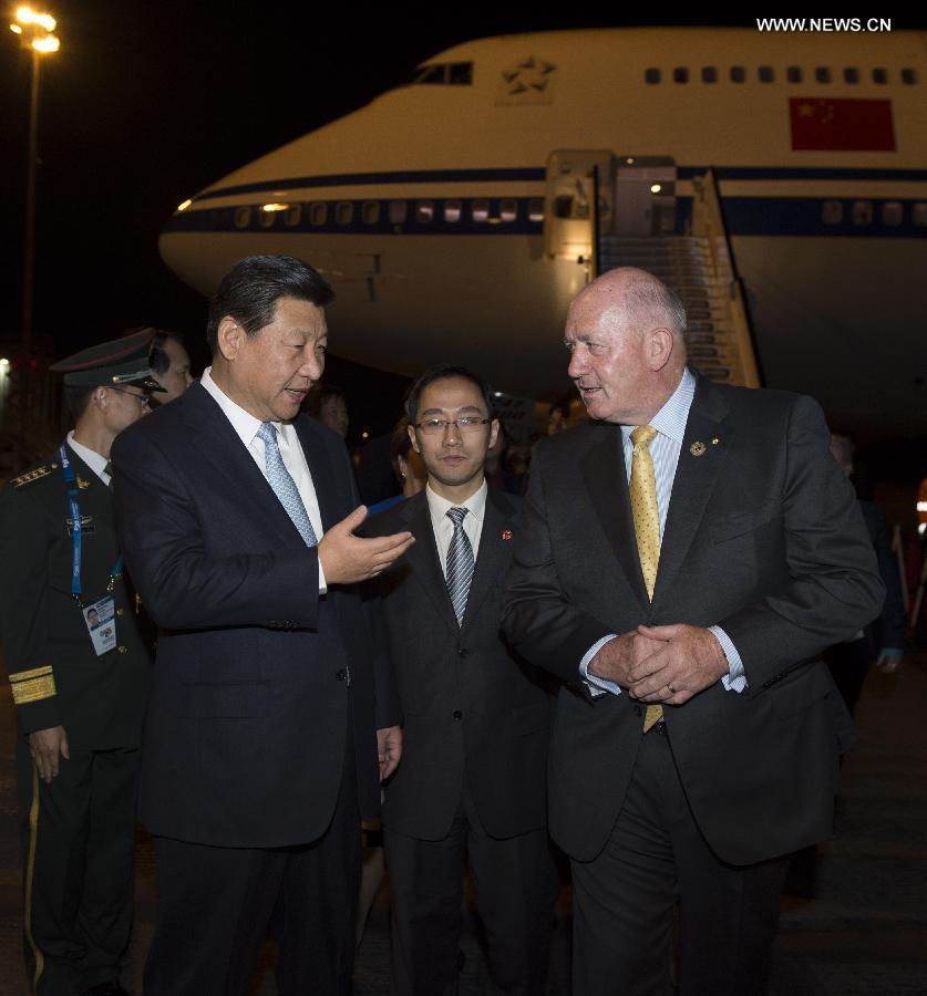| Chinese President Xi Jinping (L, front) is welcomed by Australian Governor-General Peter Cosgrove (R, front) upon his arrival in Brisbane, Australia, Nov. 14, 2014. Xi arrived here Friday to attend the 9th G20 Summit slated for Nov. 15-16 and pay a state visit to Australia after that. (Xinhua/Li Xueren) |