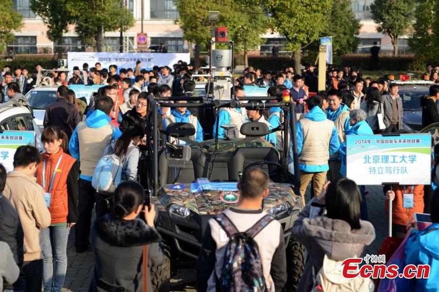 Photo taken on November 15, 2014 shows self-driving cars in an unmanned vehicle contest in Changshu of Jiangsu province. Altogether 22 cars from China’s universities and research institutions will compete with each other in the Future Challenge 2014 contest, which started on Saturday. [Photo/ Wang Sizhe]